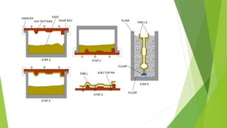 Shell moulding is a casting process that uses a sand-resin mixture to form a disposable mould around a reusable pattern. This allows for higher production rates than sand casting while also enabling more complex part geometries. The process involves creating a metal pattern, heating it, applying a sand-resin mixture to form shell halves, joining the shells to create the mould, pouring molten metal, and removing the casting after solidification. Shell moulding provides better dimensional accuracy, higher productivity, and lower labor costs than sand casting for small to medium precision parts.