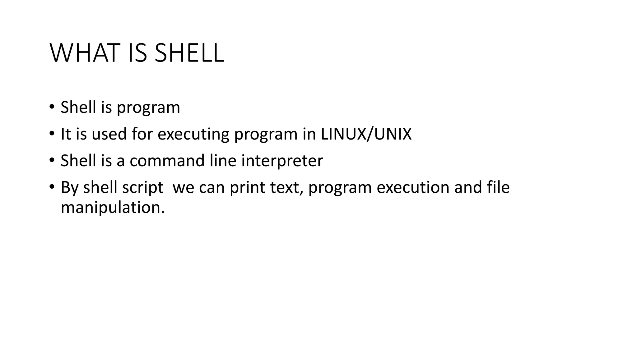 Shell is a command line interpreter used to execute programs in Linux/Unix. It allows printing text, running programs, and manipulating files through shell scripts. Shell scripts use operators like arithmetic, relational, boolean, string, and file test operators. Functions enable breaking scripts into logical subsections and creating code reuse through repetitive tasks. Functions can accept parameters, return values, and call other functions recursively.