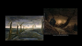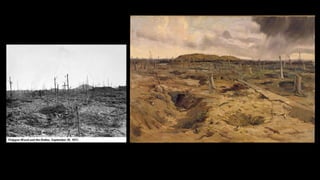 This document discusses how artists depicted the truth and horrors of World War I through their art. It provides examples of paintings, drawings, and sculptures that aimed to realistically portray experiences of soldiers like life in the trenches, gas attacks, and treating wounded veterans. The art sought to convey the bitter reality of war to those on the home front. It also examines how postwar German artists like Otto Dix and George Grosz used a style called Neue Sachlichkeit to critically depict the devastation caused by the war through disturbing, graphic images.