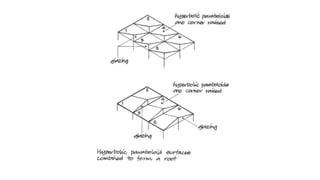 Shell structures are thin curved membranes or slabs that function as both structure and covering. They derive their strength from their thin, naturally curved form. Common types include barrel vaults with single curvature and domes with double curvature. Reinforced concrete is well-suited for constructing shells due to its ability to take any shape in formwork. Shells provide efficient, aesthetically pleasing roofing but require accurate formwork and specialized construction techniques.