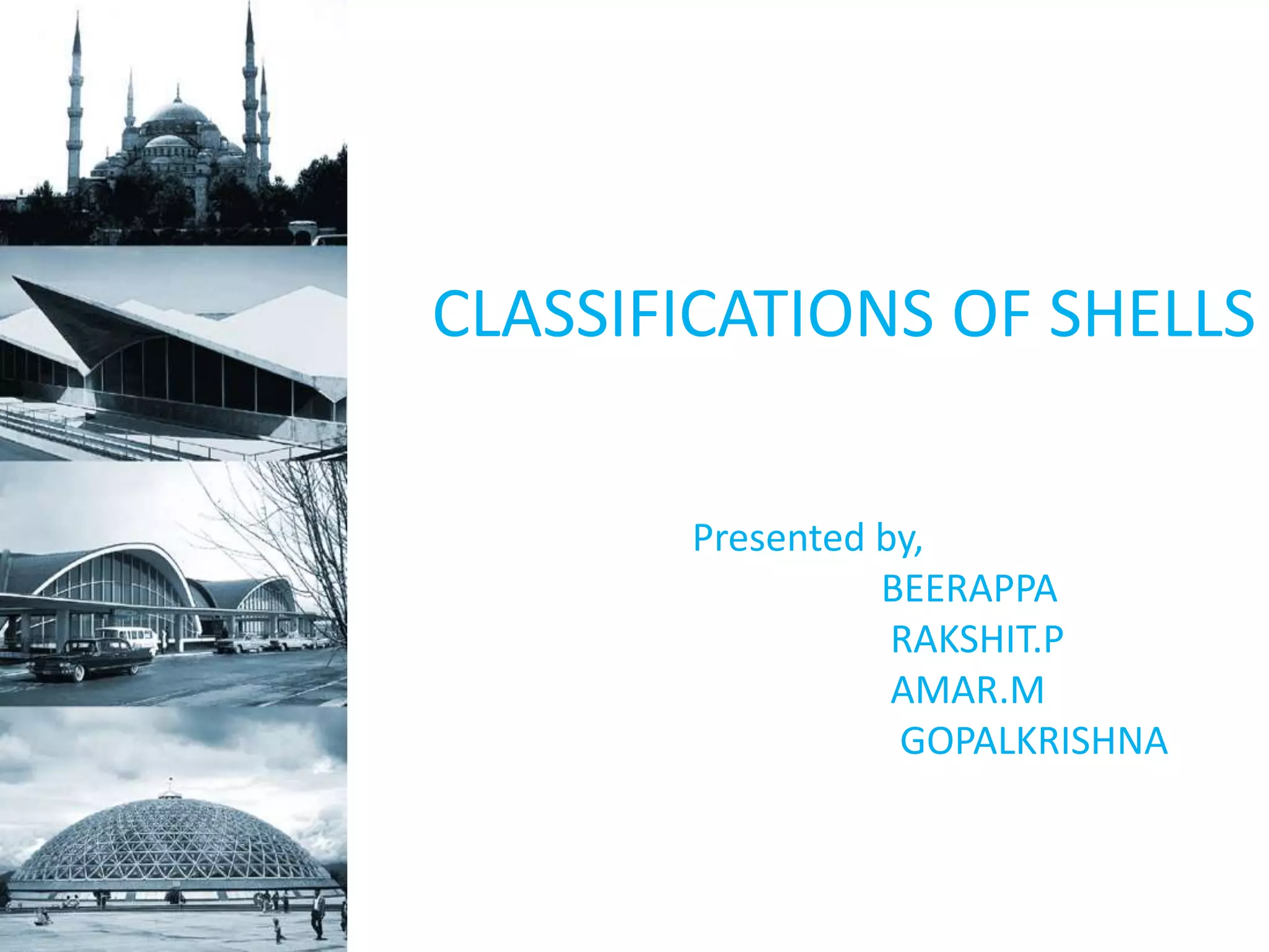 Shells can be classified in several ways, including by the material used and thickness. Thin concrete shells are lightweight structures made of reinforced concrete without internal supports. Common thin concrete shell types include barrel shells, folded plates, hyperbolic paraboloids, domes, and translation shells. Barrel shells carry loads longitudinally and transversally, while domes provide a strong, stiff structure with double curvature. Thin concrete shells offer wide open interior spaces but require sealing and ventilation to prevent moisture issues.