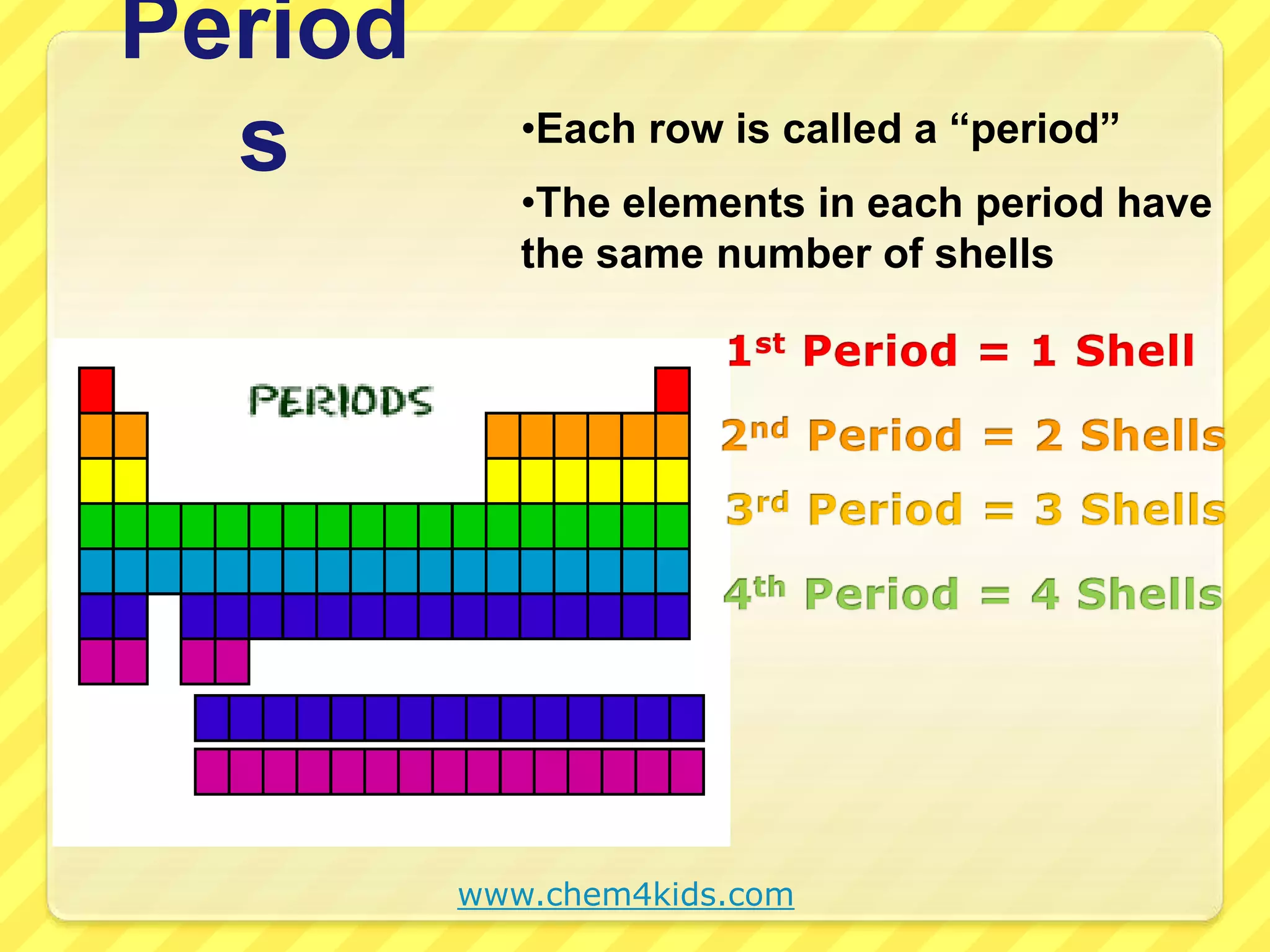 The document discusses the periodic table and properties of elements. It explains that each row of the periodic table is called a period, with elements in the same period having the same number of electron shells. It also explains that each column is called a group, with elements in the same group having the same number of valence electrons in their outer shell. The document provides examples of determining the number of shells and valence electrons for various elements based on their period and group.