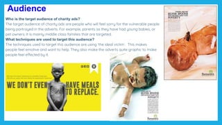 - The target audience of charity ads, which are typically middle-class families, and techniques used like portraying vulnerable people to elicit emotions.