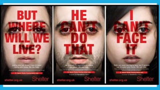 - Details on the charity Shelter, which helps people with homelessness. It summarizes Shelter's 2011 campaign in the UK that aimed to raise awareness and encourage people at risk of losing homes to seek advice.