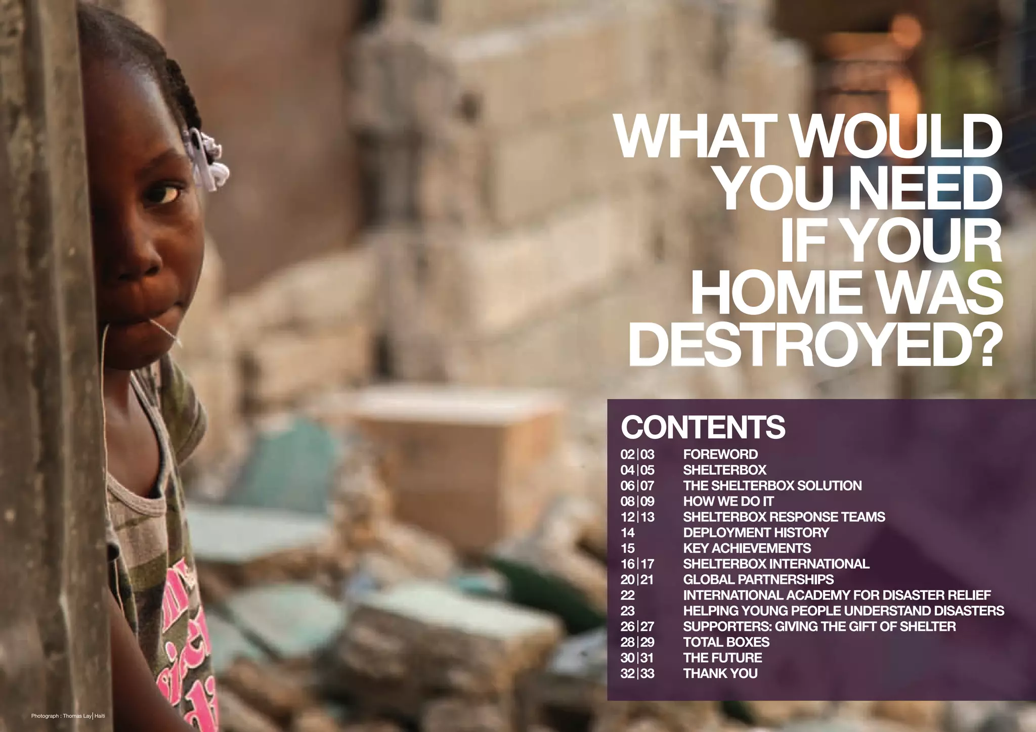 - ShelterBox was founded in 2000 to address the lack of emergency shelter assistance following disasters. It provides tents, blankets, tools and other essential supplies to help families survive and rebuild.