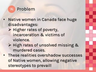 The document outlines a pitch deck aimed at empowering native women in Canada through a handbag label designed to create job opportunities and promote education about their issues. The business model focuses on direct-to-customer sales with plans for marketing and distribution while celebrating native design elements. Future plans include a crowdfunding campaign, product launches, and retail pop-up shops to support the initiative.
