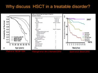 1) Hematopoietic stem cell transplantation (HSCT) is being explored as a potentially curative treatment for sickle cell disease (SCD) due to the severe complications associated with SCD including stroke, acute chest syndrome, chronic pain, and early mortality.