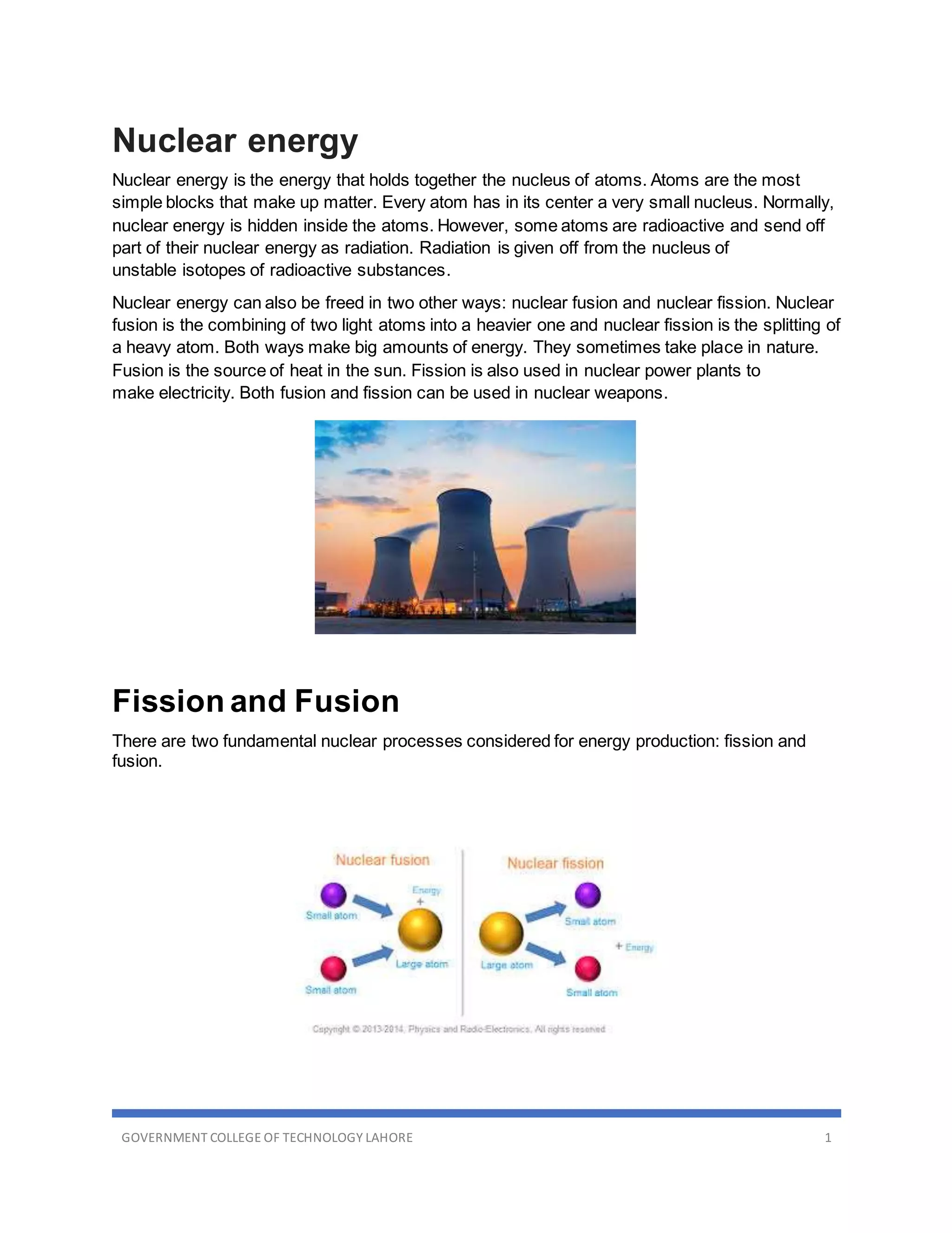 1. Nuclear energy comes from the energy stored in the nucleus of atoms and can be released through nuclear fission or fusion. Fission involves splitting heavy atoms while fusion combines light atoms.