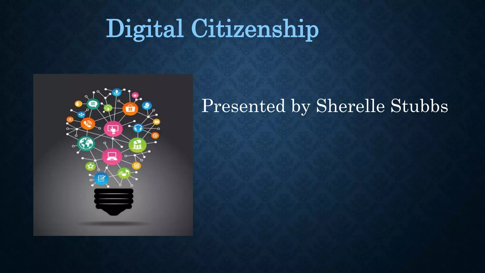This presentation discusses the nine elements of digital citizenship: digital access, digital commerce, digital communication and collaboration, digital etiquette, digital fluency, digital health and welfare, digital law, digital rights and responsibility, and digital security and privacy. Each element is briefly defined and examples are provided of how teachers can educate students about each one, such as assigning appropriate internet access, teaching safe online buying and selling, discussing proper online communication etiquette, and identifying misinformation. The overall message is that digital citizenship skills are important for students to participate safely and responsibly online.
