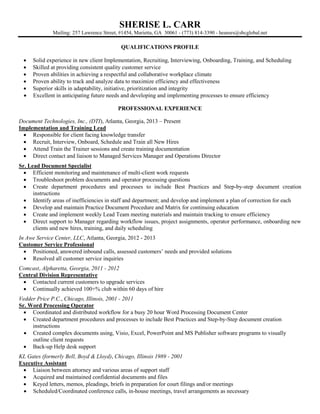 Sherise Carr has over 25 years of experience in client services roles including implementation, recruiting, training, and customer service. She currently works as an Implementation and Training Lead at Document Technologies, Inc where she is responsible for client knowledge transfer and recruiting, training, and scheduling new hires. Previously she has held roles such as Customer Service Professional, Central Division Representative, and Executive Assistant. She has strong skills in creating procedures and documentation to ensure efficiency.