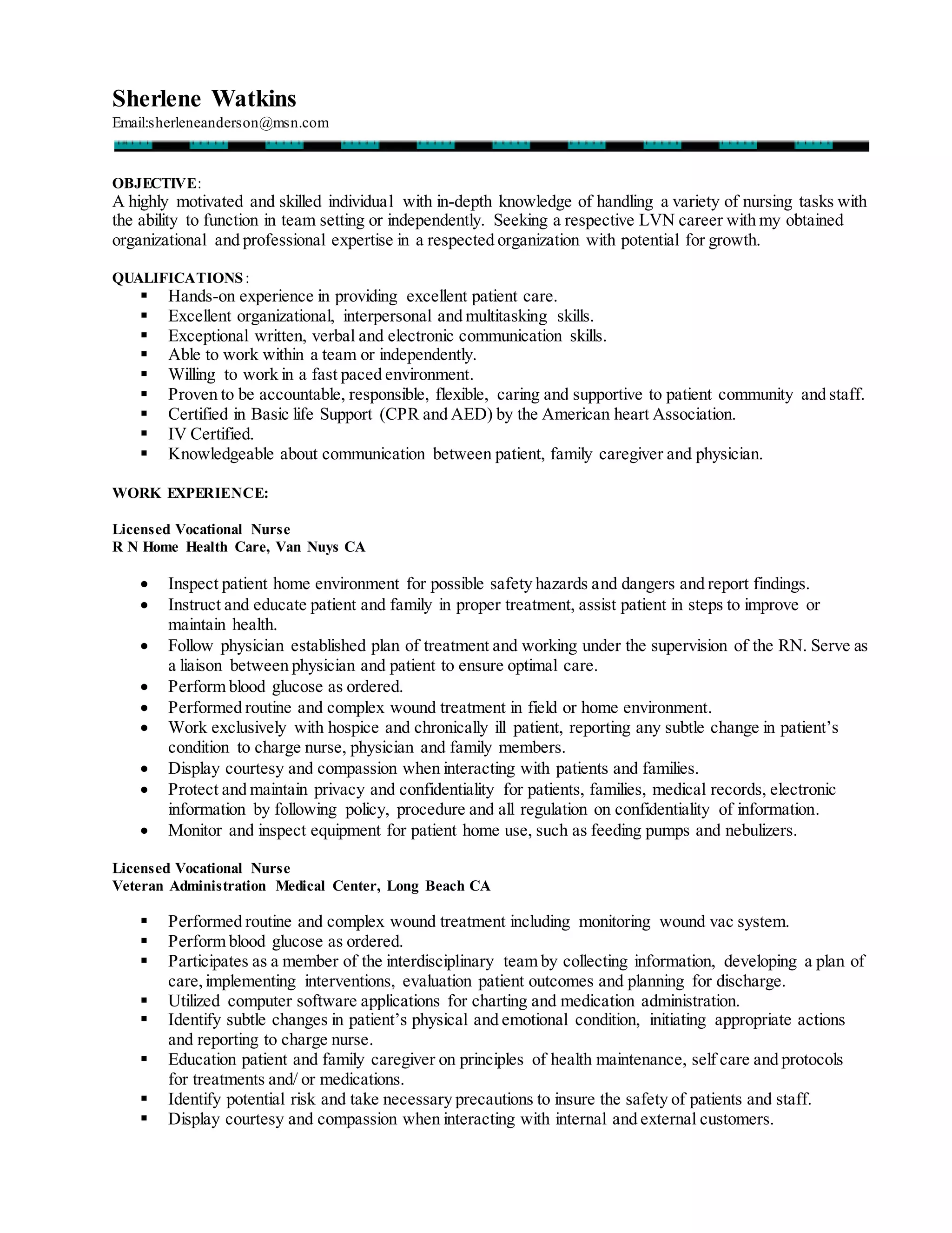 This document is a resume for Sherlene Watkins, who is seeking a position as an LVN. She has over 15 years of experience as an LVN in various healthcare settings including home health care, hospitals, nursing homes, and private duty. Her qualifications include hands-on patient care experience, excellent communication and organizational skills, certification in CPR/AED and IV therapy. She is skilled in wound treatment, monitoring patient conditions, administering medications and treatments, and educating patients.