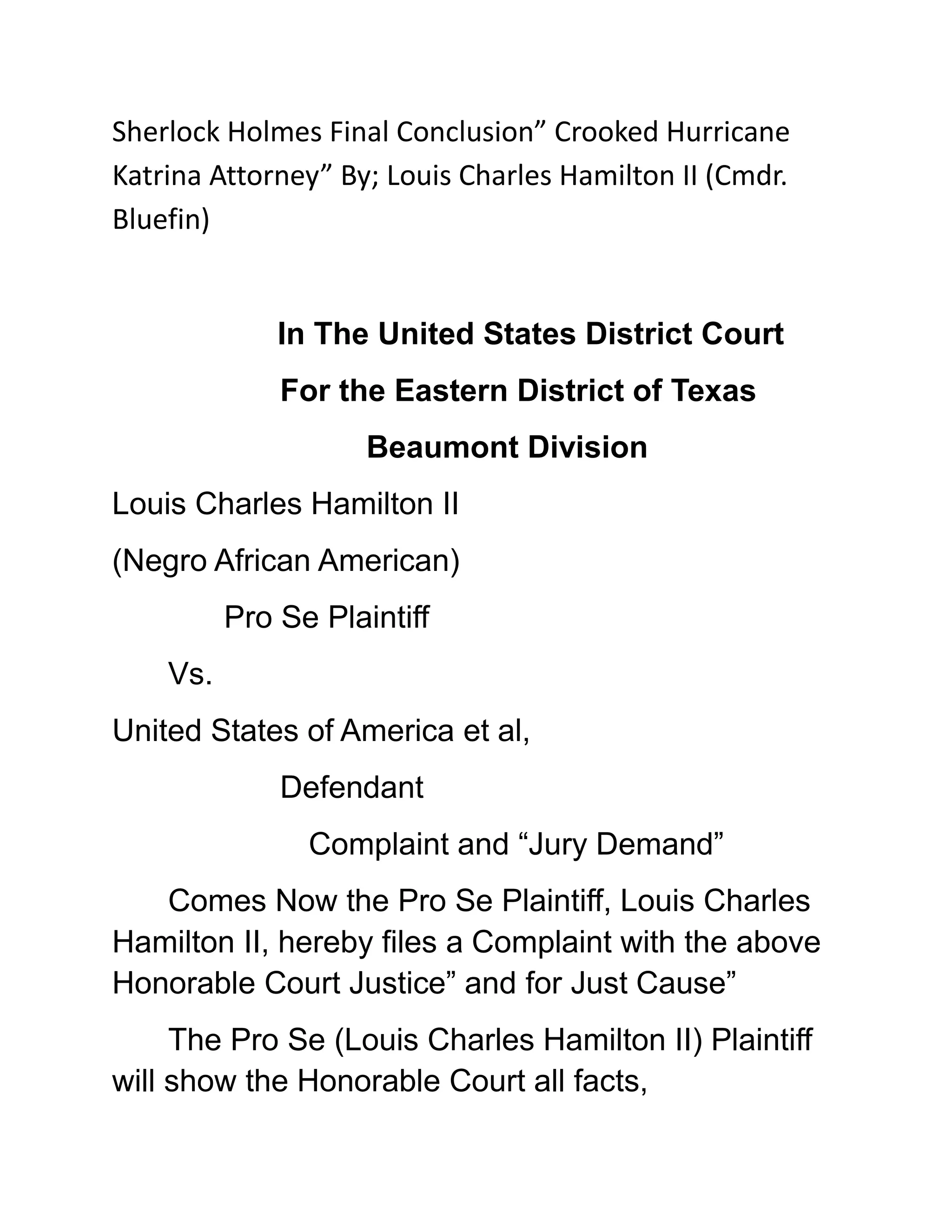 The document describes a lawsuit filed by Louis Charles Hamilton II against Walter and Rosemary Dennis related to Hurricane Katrina damage and reconstruction work. Hamilton alleges that Willie M. Zanders, acting as the attorney for Dennis, committed fraud by disguising his identity and claiming Dennis were pro se in federal court over multiple years of litigation, when Zanders was actually representing them as their attorney. Hamilton is bringing this complaint before the court to establish that Zanders committed fraud and acted as a "crooked cloak rouge attorney."