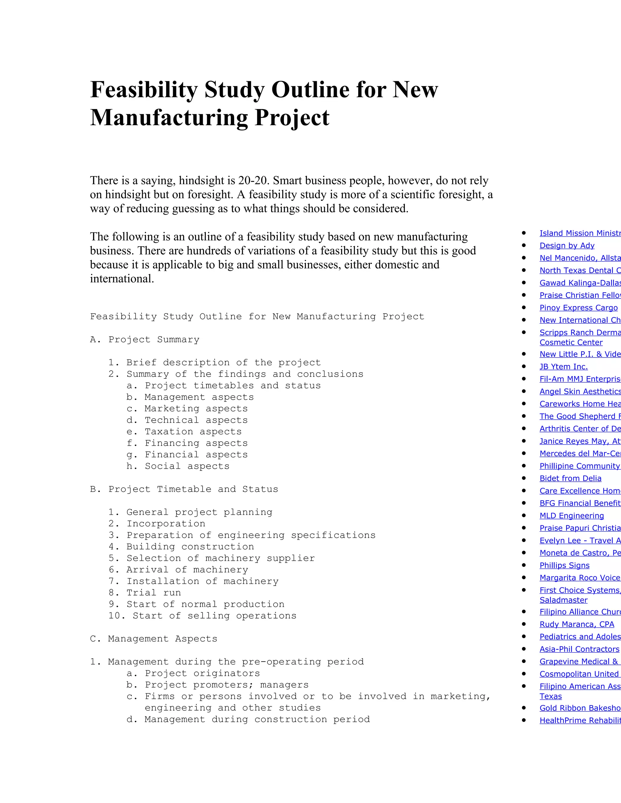 The document outlines a feasibility study for a new manufacturing project. It provides a detailed outline covering key areas to examine including: project summary, timetable and status, management aspects, marketing aspects, demand analysis, supply analysis, and financial projections. The goal is to reduce risk by comprehensively evaluating factors that could impact the viability and success of the proposed manufacturing venture.