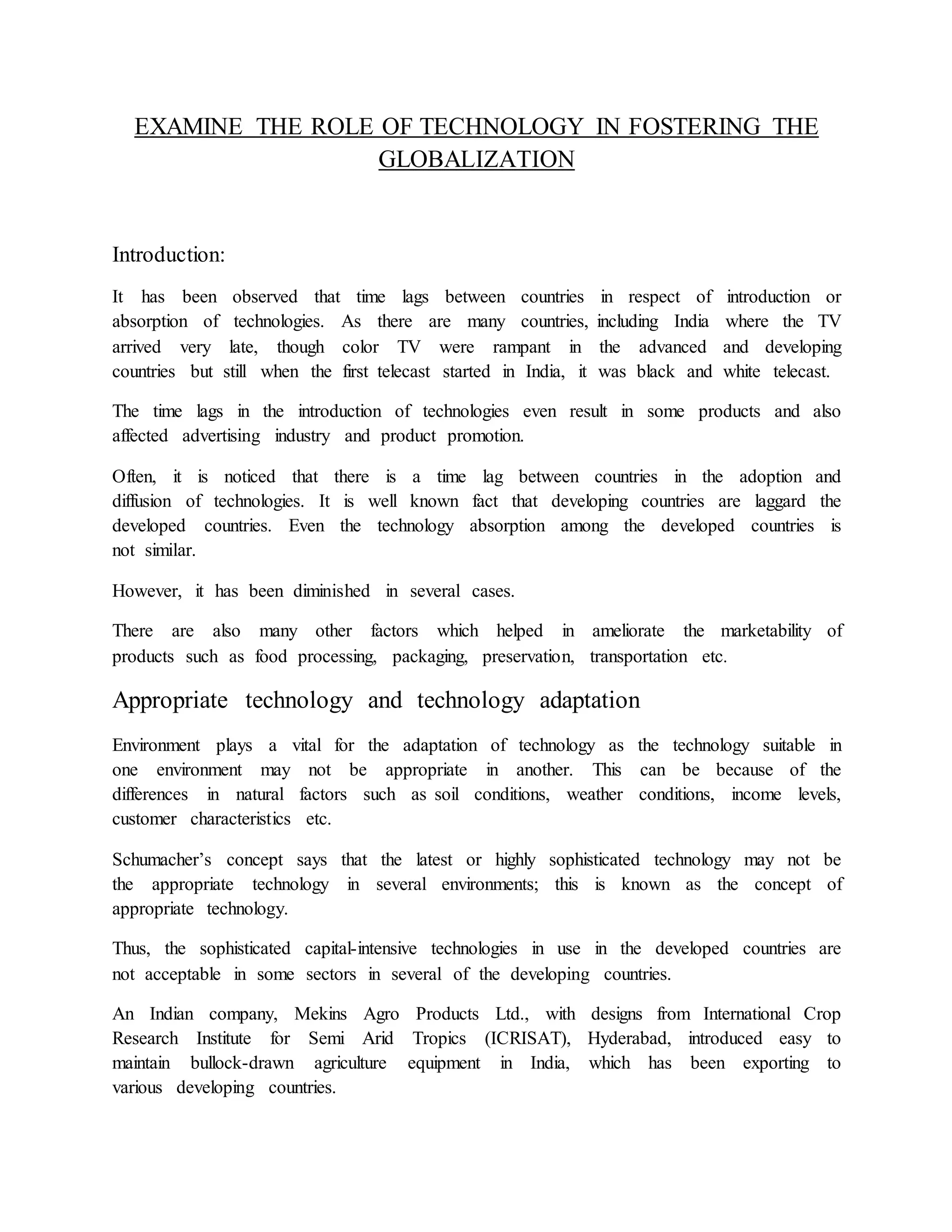 The document discusses the role of technology in fostering globalization, highlighting the time lags in the adoption of technology between developed and developing countries. It covers the importance of appropriate technology, the impact of transportation and communication advancements, and the significance of technology transfer in international business. Additionally, it outlines the challenges associated with technology transfer, including costs, appropriateness, and dependence, while emphasizing the need for proper regulation and promotion of foreign technology to benefit developing nations.