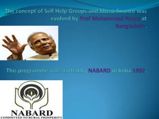 This document discusses the history and development of self-help groups (SHGs) in India. It notes that SHGs first emerged in the 1970s to provide microfinance and empower women. Major organizations like NABARD, MYRADA, and SEWA promoted SHG models. By the 1990s, NABARD began large-scale promotion of SHGs and banks started allowing SHG savings accounts. SHGs are now widespread across India, with millions of members, providing financial services and livelihood support to rural communities while empowering women. The most common model involves NGOs forming SHGs that are then linked to banks for credit.