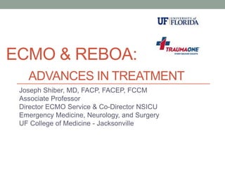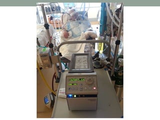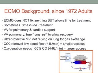 ECMO provides lung and heart support to allow time for treatment when time is the treatment. It is used for conditions like ARDS, lung trauma, heart attacks, and as a bridge to transplant. Outcomes have improved at ECMO centers.