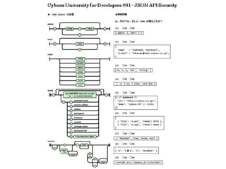 JSON object の定義例:{"string":value, "key": value}An object is an unordered set of name/value pairs. An object begins with { (left brace) and ends with } (right brace). Each name is followed by : (colon) and the name/value pairs are separated by , (comma).