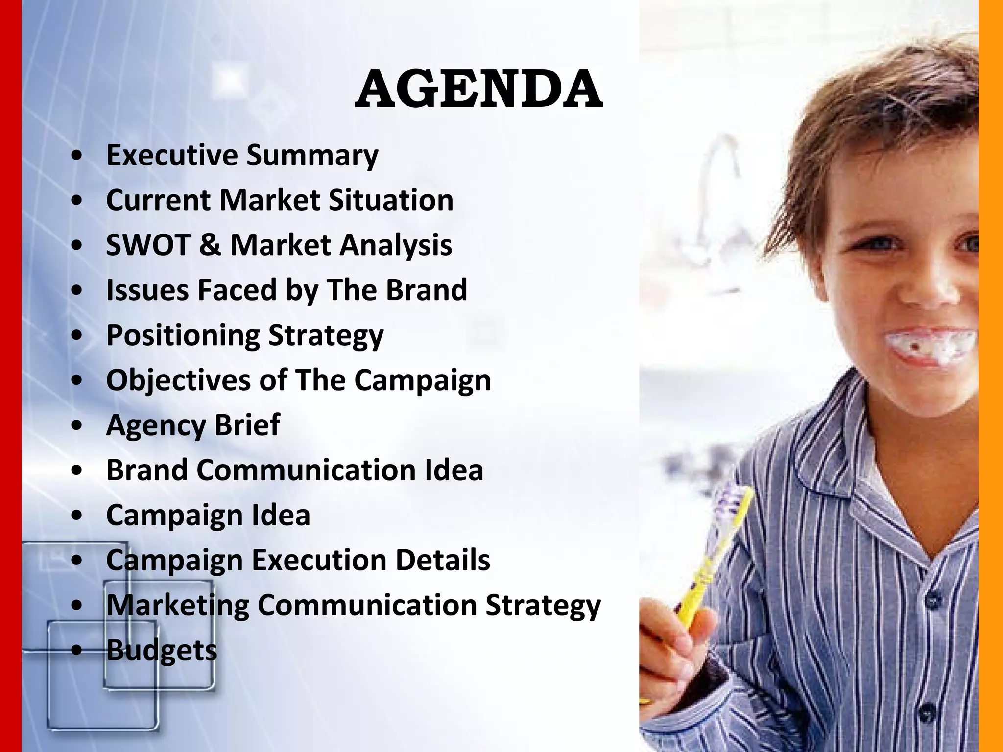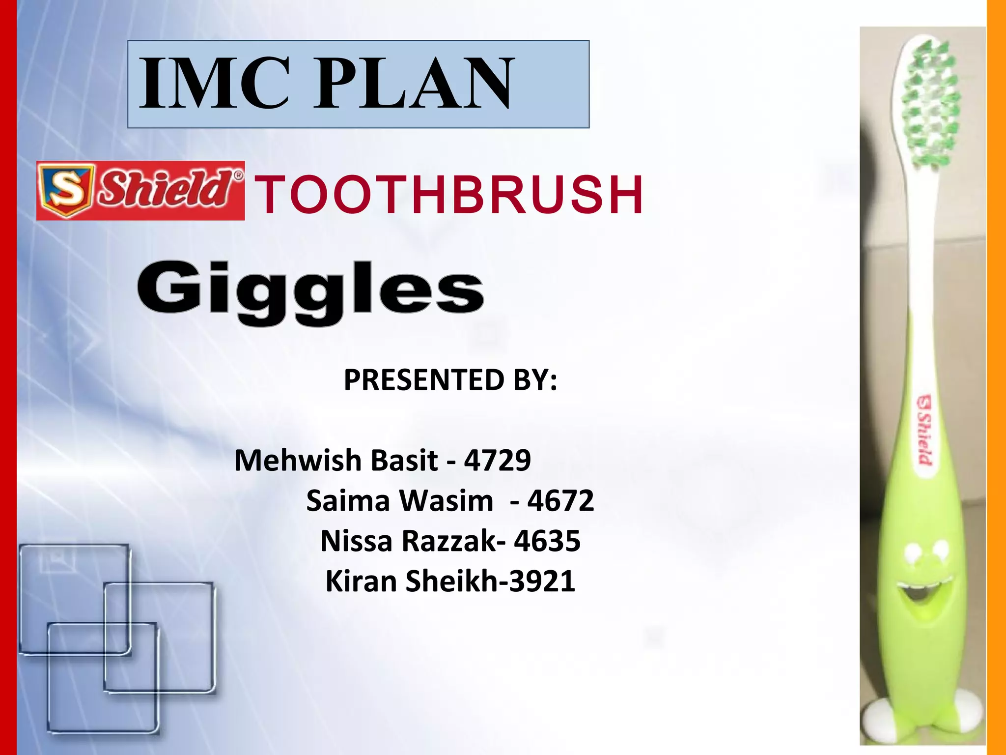 The document provides an IMC plan for Giggles toothbrush aimed at children aged 5-10. The plan's objectives are to generate trial amongst non-users, achieve a 40% purchase rate, and become the most preferred local brand. Insights indicate kids find toothbrushing boring and prefer colorful, fun toothbrushes. The proposed positioning positions Giggles as adventurous and exciting to change kids' perceptions of toothbrushing. The campaign ideas center around making toothbrushing an adventure rather than a chore.