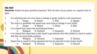 This document provides an overview of hazards and risks in the workplace. It defines a hazard as any situation or object that could cause harm. Hazards are classified as physical, chemical, biological, or ergonomic. The document also discusses personal protective equipment (PPE) and gives examples of PPE used to protect different parts of the body, such as safety hats for the head, goggles for eyes, ear protection, gloves for hands, safety shoes for feet, and respiratory equipment. The overall goal is to educate about differentiating hazards from risks, evaluating risks in the workplace, properly using PPE, and following safety procedures.