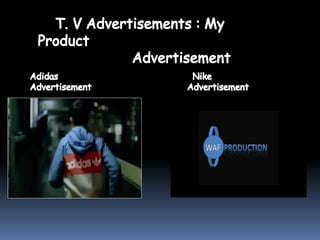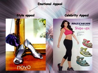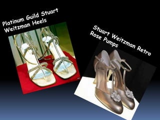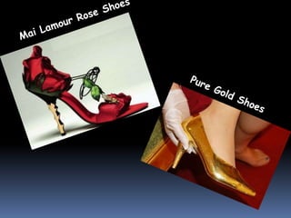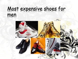 This document discusses different types of shoes categorized by heel height and provides examples. It also lists the top 10 shoe brands and some of the most expensive shoes made by Nike and Adidas that feature precious gemstones. Two charts compare indoor, outdoor, and display media for brands in terms of brand, sports, and style appeal.