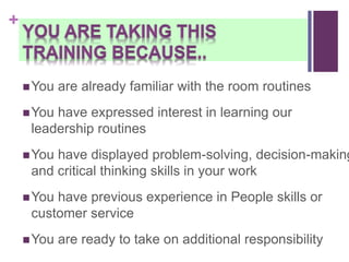 This document outlines the roles and responsibilities of leadership positions for a youth program. It describes the duties of Shift Leaders and Member Coordinators which include managing employee issues, member concerns, program schedules, and emergency procedures. It also discusses the program management cycle of initiation, planning, execution, monitoring, and closing. Soft skills and standard operating procedures are highlighted.