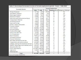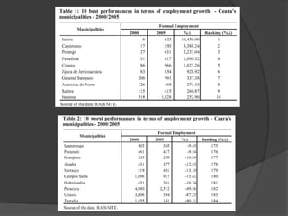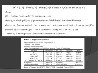The document presents a shift-share analysis of employment growth in Ceará, Brazil, from 2000 to 2005, detailing how regional, national, and industry factors contribute to job changes. Key findings indicate that population density positively correlates with employment growth, while agglomeration diseconomies in the capital, Fortaleza, hinder its job creation. The analysis categorizes municipalities based on their growth dynamics, revealing that many regions experienced positive net employment change despite a significant number showing negative industry mix components.