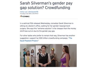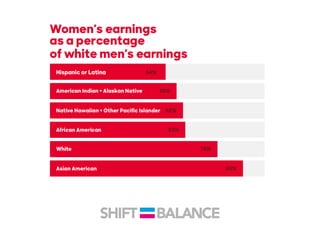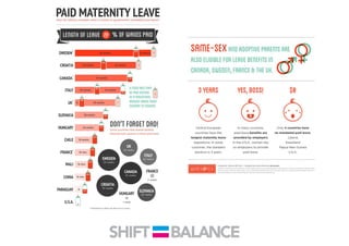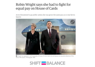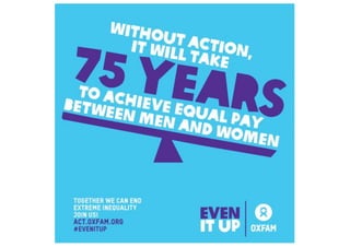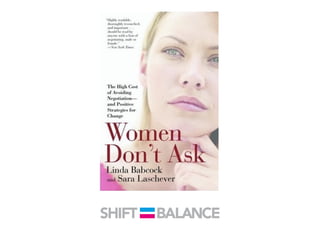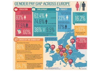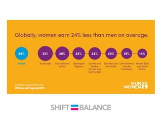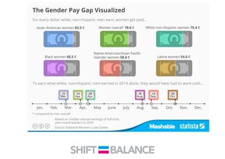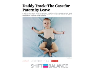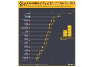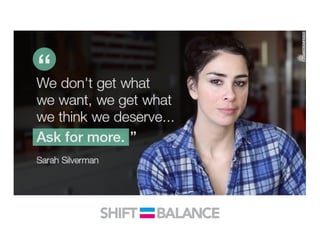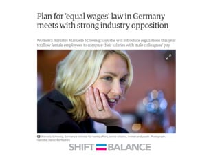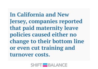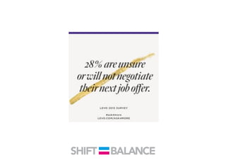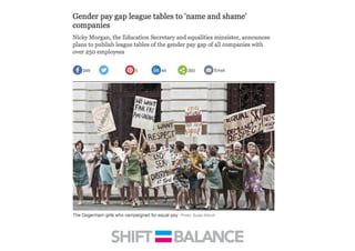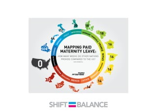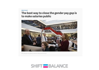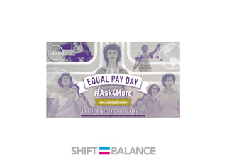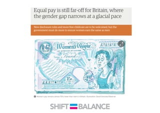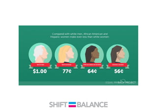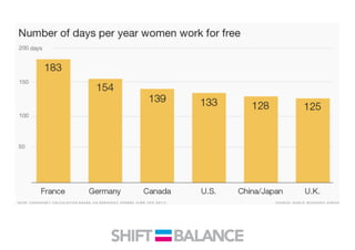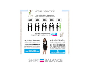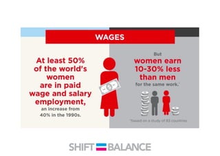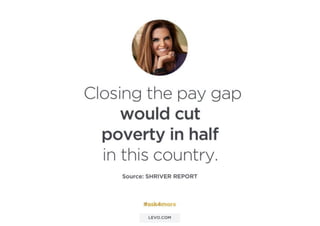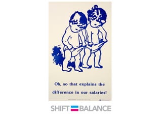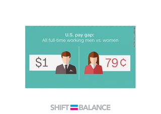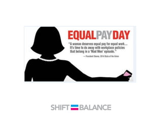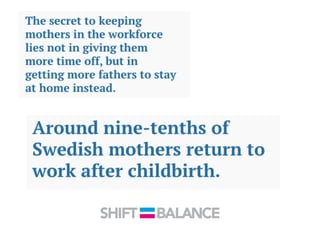 This document discusses strategies to address the gender pay gap, including women only doing 78% of their work if paid 78% of what male colleagues earn, negotiating salaries better, and making negotiation a norm. It provides solutions like ensuring fair pay and compensation reviews, evaluating performance fairly by having clear criteria and accountability, and facilitating equal and lengthy maternity and paternity leave policies like Sweden's to encourage fathers to take parental leave.