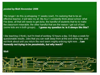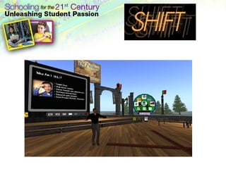 The document discusses the need for schools to shift from traditional models of teaching and learning to models suited for the 21st century. It notes that learning is becoming more collaborative, participatory and networked as the world becomes more connected through technology. Half of what students learn in their first year may be outdated by their third year, so schools must focus on lifelong learning and preparing students for an uncertain future.