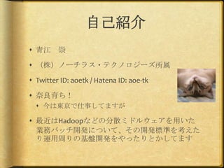 (株)ノーチラス・テクノロジーズ所属 Twitter ID: aoetk / Hatena ID: aoe-tk 奈良育ち! 今は東京で仕事してますが 最近はHadoopなどの分散ミドルウェアを用いた 業務バッチ開発について、その開発標準を考えた り運用周りの基盤開発をやったりとかしてます
