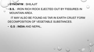 Shilajit is an herbo-mineral drug that is found as a tar-like substance oozing from rocks in mountainous regions of India and Nepal. It exists in different varieties that range in color from blackish-brown to blue, white, and red depending on their mineral content. Shilajit has various medicinal uses as a general tonic, to strengthen and boost immunity, and to treat skin diseases, leprosy, headaches, and infections due to its chemical composition of fatty acids, trace elements, and albuminoids. It is commonly marketed in formulated products.