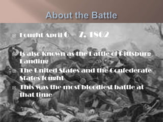 The Battle of Shiloh, also known as the Battle of Pittsburg Landing, was fought April 6-7, 1862 in Tennessee between the United States and Confederate States. It was one of the bloodiest battles of the American Civil War so far, with over 23,000 casualties between the two sides. In the end, the United States forces led by Ulysses S. Grant and Don Carlos Buell defeated the Confederate forces led by Albert Sidney Johnston and P.G.T. Beauregard.