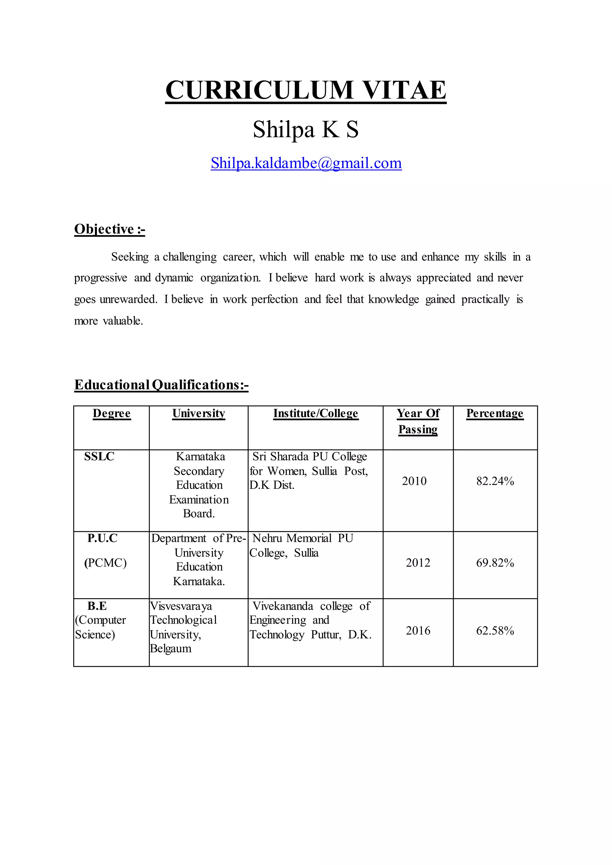 Shilpa K S is seeking a challenging career where she can use and enhance her skills. She has a Bachelor of Engineering degree in Computer Science from Vivekananda College of Engineering and Technology. Her professional experience includes working as an intern at ZenRays Technologies where she worked on projects involving a Learning Management System and System Centre Operations Manager. Her college projects demonstrate car simulation functions and a framework for authenticating data collaboration. She has skills in languages like C, C++, SQL, HTML, and frameworks like Drupal, CSS, jQuery, and Ajax.