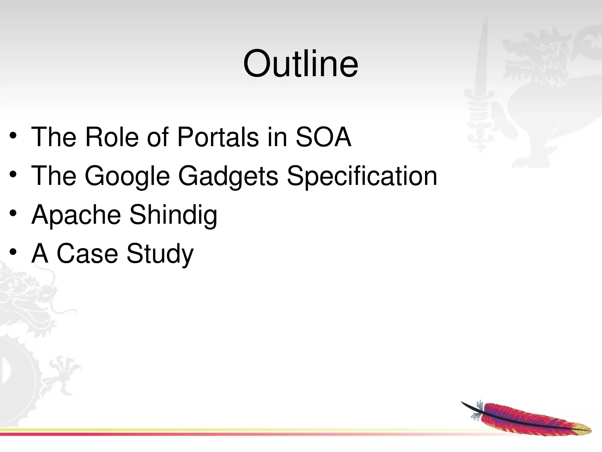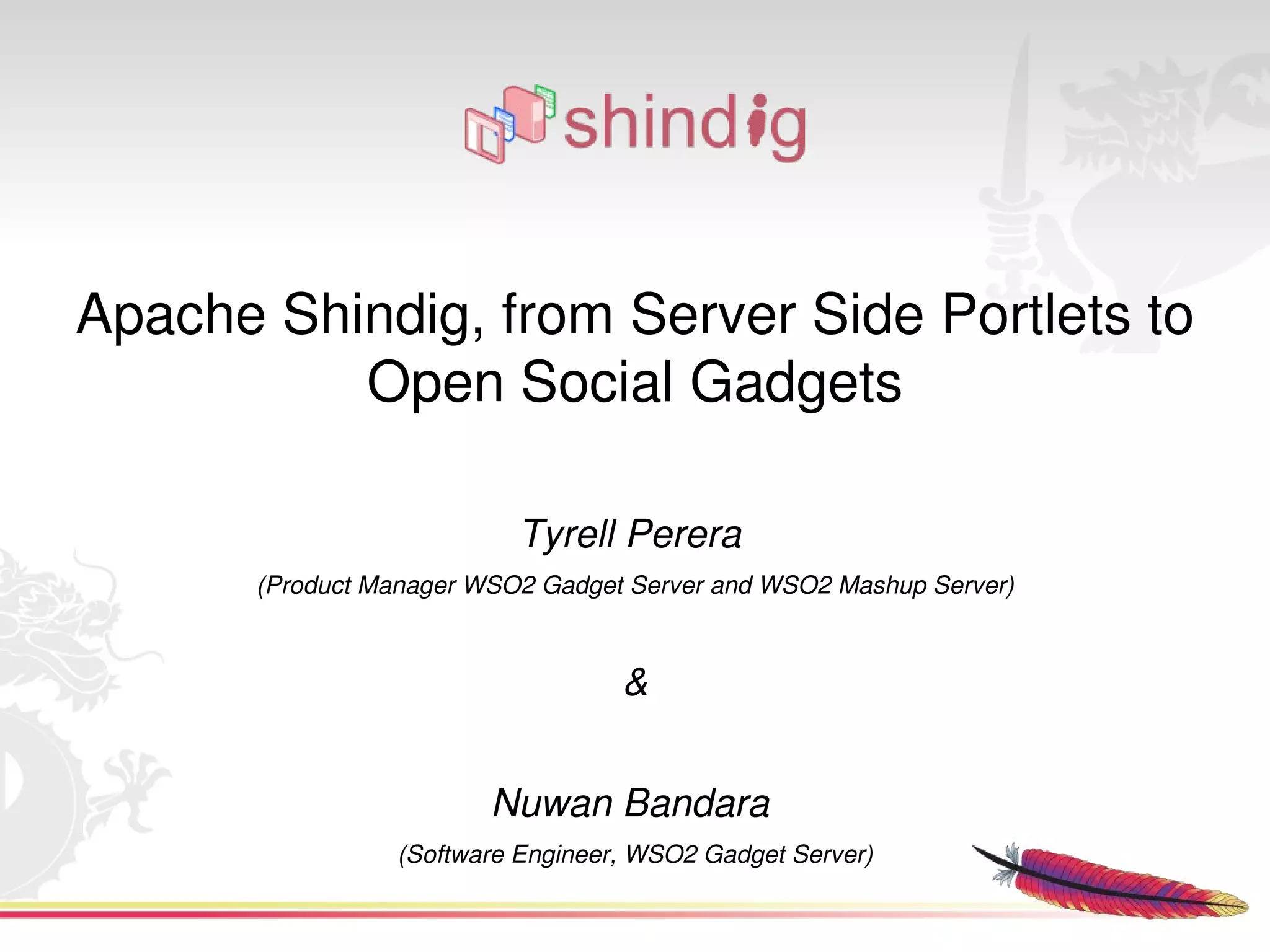 Apache Shindig is an open source gadget container that allows developers to easily write reusable web applications using HTML, CSS and JavaScript. It supports the Google Gadgets specification and OpenSocial specification, allowing gadgets to be embedded into various contexts like websites and portals. The authors used Apache Shindig to power their portal server, bundling it using OSGi and enabling features like caching to improve performance. They were able to build a comprehensive portal with open standards and a gadget repository browser.