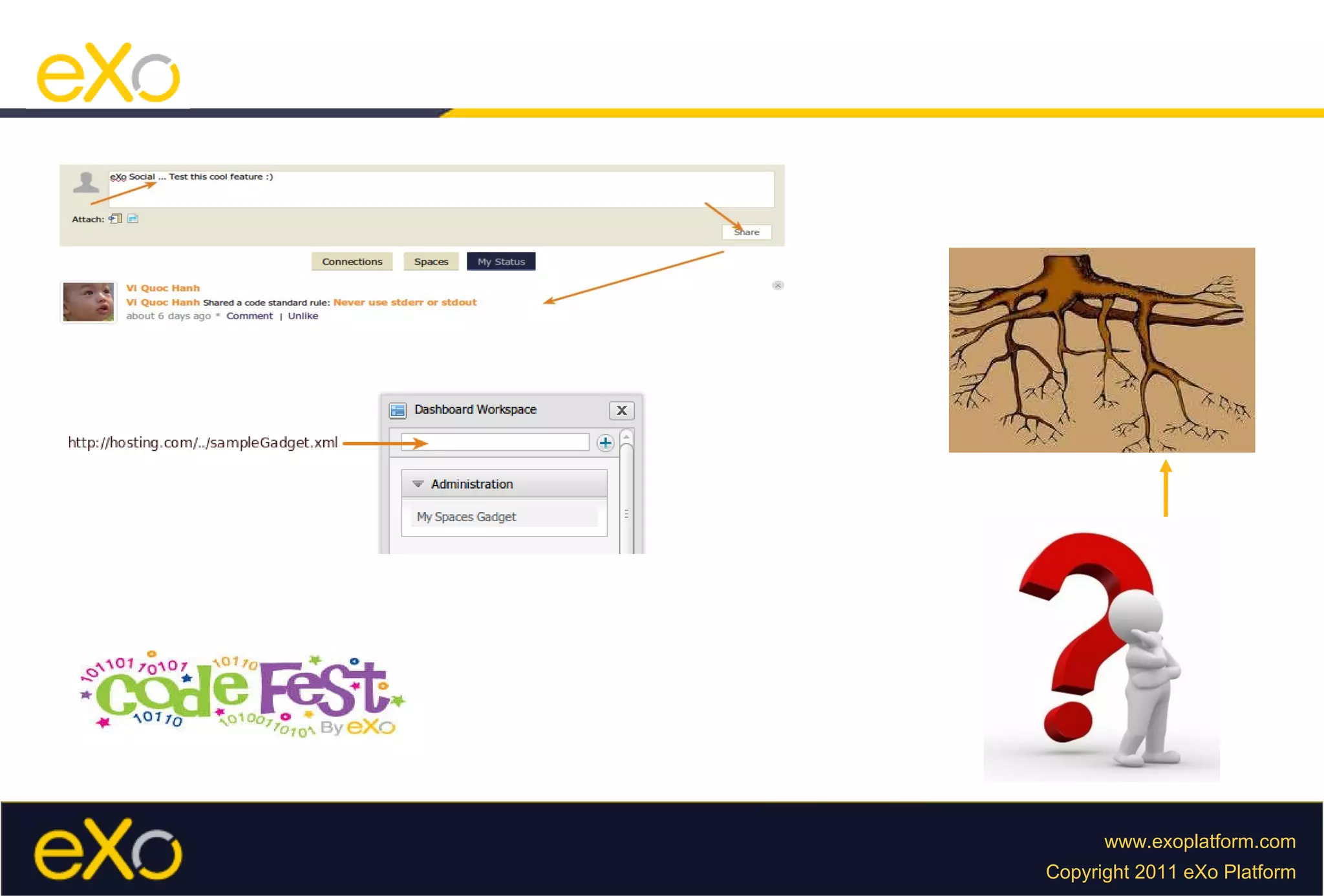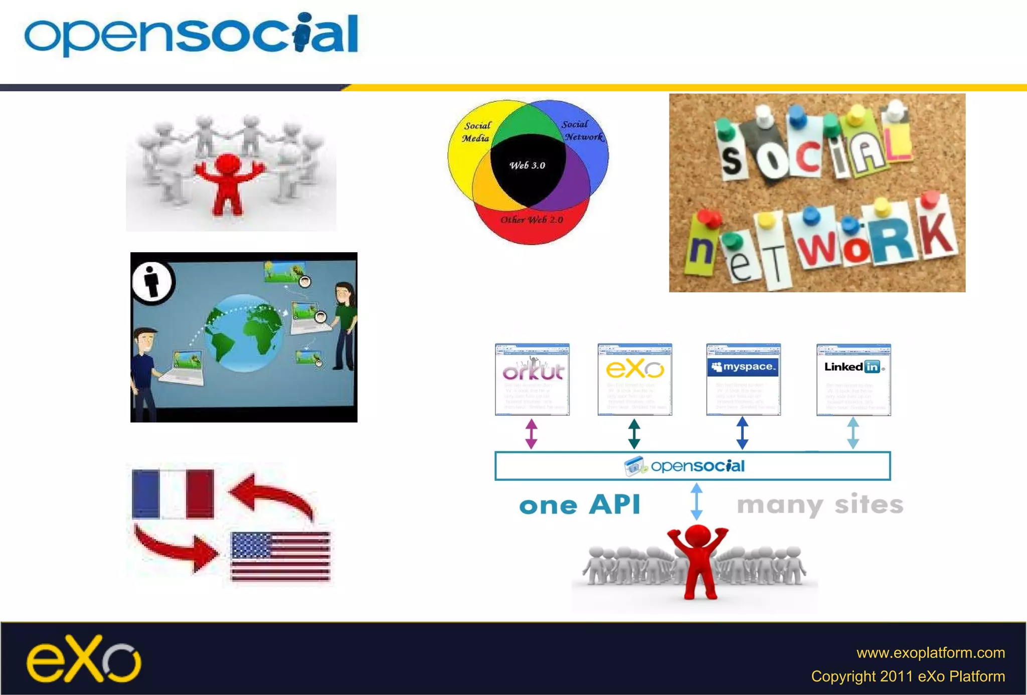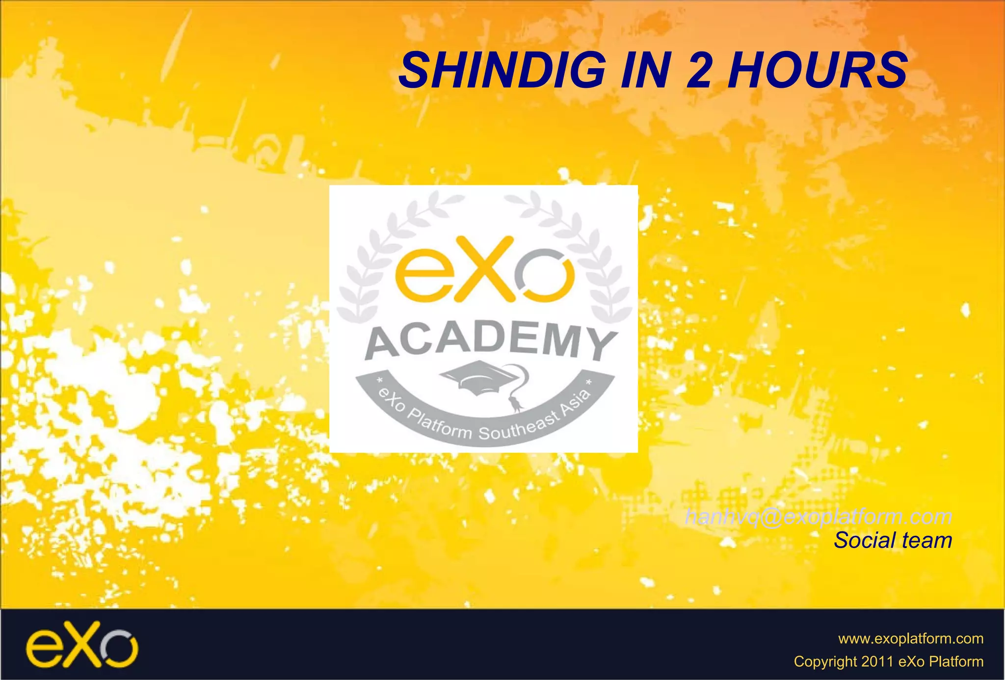 This document discusses integrating the Apache Shindig open-source social container with eXo Platform. It provides an overview of Shindig's architecture and components, describes how to customize Shindig by implementing interfaces for people, activities, and writing Guice modules, and configuring servlets and filters in the web.xml file. The objective is to launch a new Shindig container within eXo Platform in under an hour.