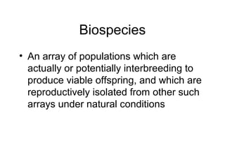This document discusses the concept of biological species and mechanisms of reproductive isolation that can lead to speciation. It defines a biospecies as populations that interbreed and produce viable offspring, but are reproductively isolated from other such groups. Speciation can occur through geographic isolation (allopatric speciation) or within the same area (sympatric speciation) due to changes in chromosomes, anatomy, chemicals, ecology or behavior. The document also discusses challenges in defining species and patterns of evolutionary change, such as phyletic gradualism versus punctuated equilibrium.