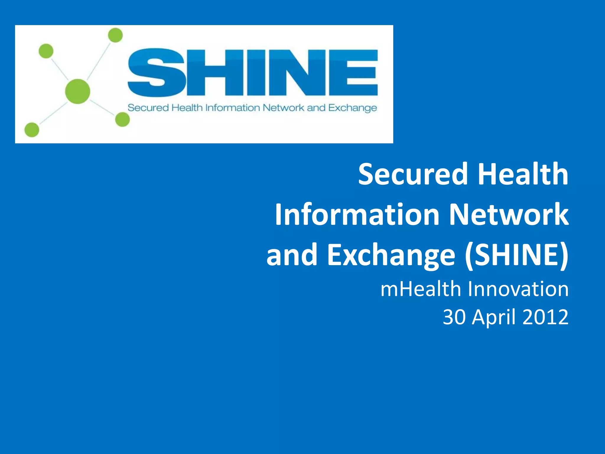 The SHINE project is an electronic health information and referral system designed for healthcare providers, utilizing mobile and internet technologies to improve healthcare delivery, especially for underserved communities. It facilitates patient record management, reminders, referrals, and reporting through a user-friendly platform integrated with existing health data systems. SHINE aims to enhance healthcare accessibility and coordination among various stakeholders through a public-private partnership.