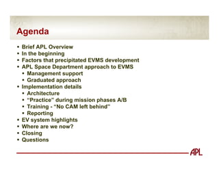 This document discusses APL's incremental approach to implementing Earned Value Management System (EVMS) across its Space Department projects. It describes how APL gained management support, took a graduated approach over time, and focused on training to ensure "No CAM left behind." It implemented EVMS on smaller projects first before requiring it more broadly. Training emphasized showing engineers and scientists the value of EVMS to managing projects. The goal was to create advocates and minimize resistance to change.