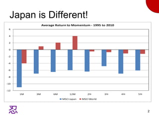 - Momentum investing in Japan by buying the worst performing stocks and shorting the best could double returns during periods when the overall market was halving.