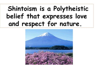 Shinto is Japan's ancient polytheistic religion that expresses love and respect for nature. Shinto has no identifiable founder or holy texts. Kami refer to Shinto deities or spirits that can be forces of nature, important people, or natural objects. Shrines are built dedicated to specific kami, and ceremonies include cleansing rituals, offerings, prayers, and dances to ask the kami for blessings. Physical cleanliness, respect for traditions and family, and love of nature are core tenets of Shinto.
