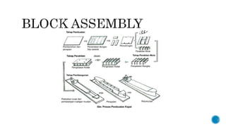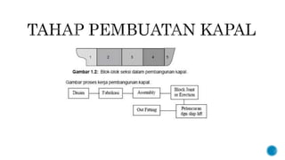Dokumen ini menjelaskan proses pembuatan dan desain kapal, termasuk perhitungan dasar, desain hull, outfitting, dan tahapan pengerjaan dari pembuatan hingga peluncuran. Proses ini melibatkan berbagai metode dan teknologi, serta pembagian kerja yang efisien dalam perakitan komponen kapal. Selain itu, dijelaskan juga pentingnya evaluasi dan pengujian performa kapal sebelum operasional.
