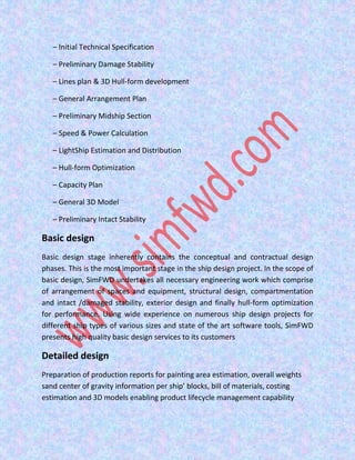 Simfwd offers integrated design and engineering services for maritime, offshore, and shipbuilding projects from conception to lifecycle maintenance. Their services include conceptual design, basic design, and detailed design, encompassing tasks such as stability calculations, hull optimization, and production report preparation. Located in Athens, Greece, they leverage extensive experience and advanced software tools to deliver high-quality outcomes for various ship types.