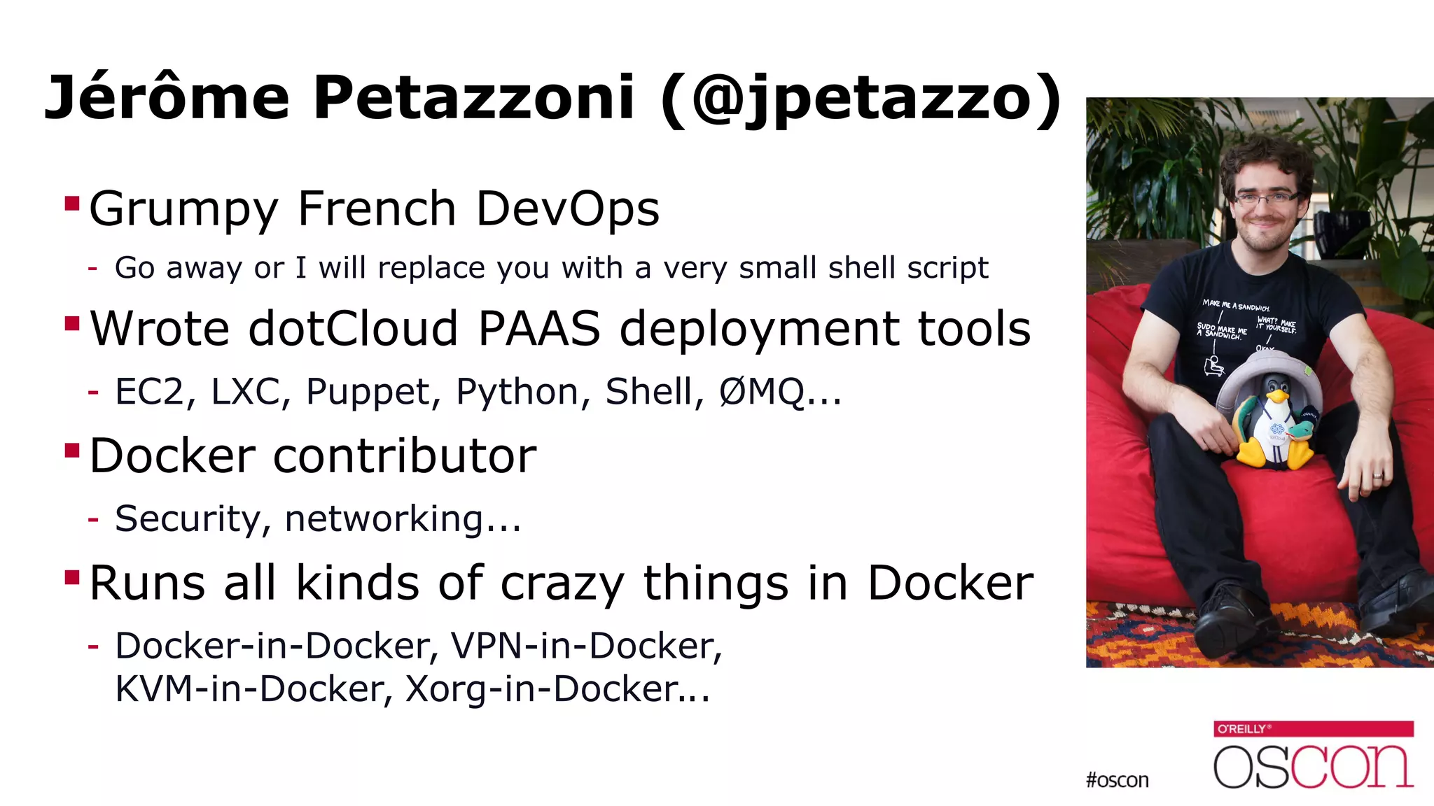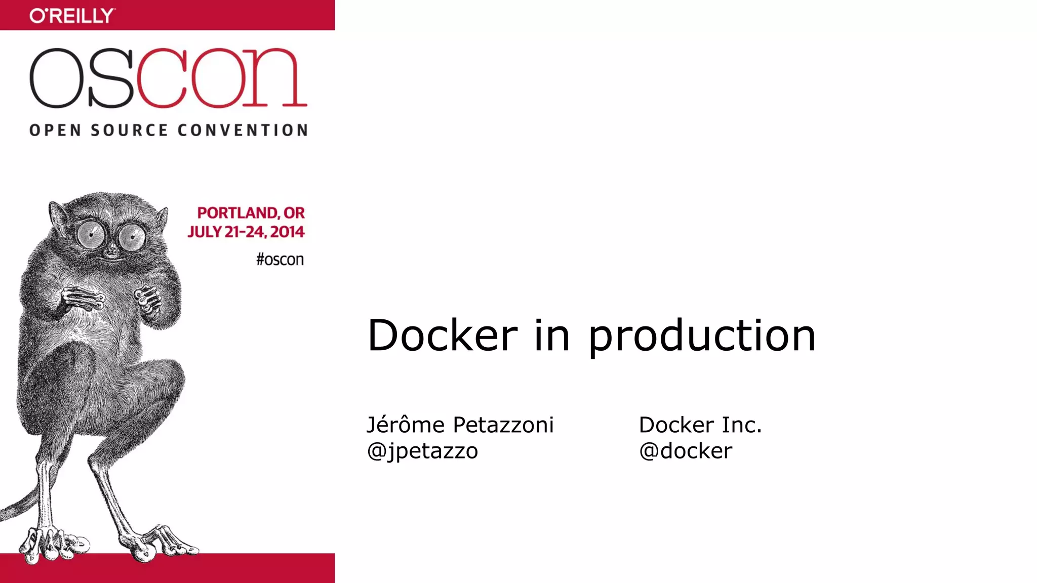 This document provides an overview and introduction to using Docker in production environments. It discusses how Docker can help with "solved" problems like installing, building, and distributing applications. It also covers important areas for production Docker usage, such as service discovery, orchestration, performance, configuration management, and sysadmin tasks. The document outlines various approaches in each area and notes that there are often multiple valid solutions to consider.