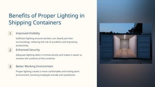 Shipping containers often lack adequate lighting which is essential for visibility, safety, and functionality. Proper lighting improves visibility, enhances security, and creates a better working environment, while options include LED, fluorescent, and solar-powered lighting. Key factors to consider when choosing lighting solutions include energy efficiency, durability, brightness, coverage, and ease of installation and maintenance.