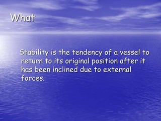 This document discusses ship stability and the factors that determine a vessel's stability. It defines stability as a ship's tendency to return to its original upright position after being inclined by external forces. The key factors that determine a ship's stability are the location of the metacenter (M), center of gravity (G), and center of buoyancy (B). When these points are properly aligned and the metacentric height is sufficient, the ship is in stable equilibrium. However, if the points become misaligned, such as from excessive free surface effect, the ship's stability can be compromised. Maintaining proper stability is important for safety and commercial decisions regarding cargo capacity and vessel allocation.