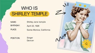 Shirley Temple was a famous American actress, singer, and dancer. She began her career in 1928 at age 3, starring in short films and becoming a national celebrity with films like "Stand Up and Cheer" in 1933 and "Bright Eyes" in 1934. Temple worked with acclaimed tap dancer Bill Robinson in the 1935 film "The Little Colonel," which marked the first interracial dancing couple in movies. Over her career from 1931 to 1961, Temple starred in 14 short films and 43 feature films, becoming one of the biggest box office stars of the 1930s and 1940s.