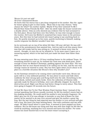 The document provides background on Bruno, a boy who feels different and struggles to fit in. As a child, Bruno liked to be the center of attention and misbehaved to get noticed. In the present, Bruno argues with his mother about being allowed to go to the market. His mother surprises him by hugging him and saying she understands he finds it hard to fit in. She sends him to the market to get apples for dinner with important guests. The document also briefly discusses the aging king's inability to rule and the need to choose a new king for London from among respected people in the region.