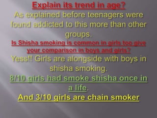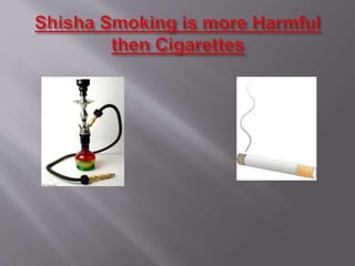Shisha smoke contains high levels of toxic compounds like tar, carbon monoxide, heavy metals, and nicotine. While some claim shisha is safer than cigarettes, research shows shisha smoke contains similar or greater levels of these harmful substances. Shisha smoking poses serious health risks, particularly to the lungs and heart, increasing risks of cancers, lung diseases, and negative impacts on fetal development. Many university students, especially males, regularly use shisha.