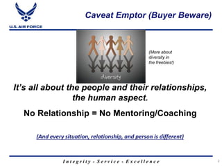 This document outlines seven rules for effective mentoring and coaching. It discusses the importance of focusing first on developing relationships and facilitating teams before solving problems. The rules emphasize hands-on experience to build credibility, continuing personal learning, thinking ahead of students, treating all students equally, using analogies and metaphors, and recognizing that data illuminates rather than dictates solutions. Successful mentoring is defined as transferring knowledge so students can apply it effectively in real-world situations. Success is measured by the mentor becoming invisible as the student demonstrates their learning.