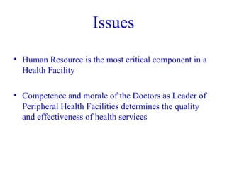 The document analyzes determinants of doctor performance in public health systems in three states of India. It finds that all three states have significant doctor vacancies, with Jharkhand filling only 30-95 of 96-131 positions across different districts. Rajasthan has 8,162 doctor positions but 745-658 new positions per year, leaving 2,991 vacancies. Uttarakhand has 946 doctors against a sanctioned 1,922 positions. Peripheral health facilities generally lack adequate doctors, medical infrastructure and support systems. Recruitment challenges, contractual uncertainties and lack of promotions contribute to poor retention of doctors in rural areas.