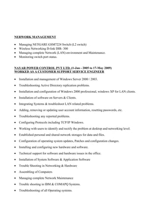 Shiv Kumar is seeking a position that allows him to enhance his knowledge and skills while contributing to an organization's goals. He has 9 years of experience in IT, including desktop support, networking, switches, routers and telecom. His skills include server, file, print server and network maintenance along with experience in various Windows operating systems. He has held positions as a Senior Systems Engineer and Assistant Accountant where he performed tasks like desktop management, network management, software installation and troubleshooting hardware and software issues.